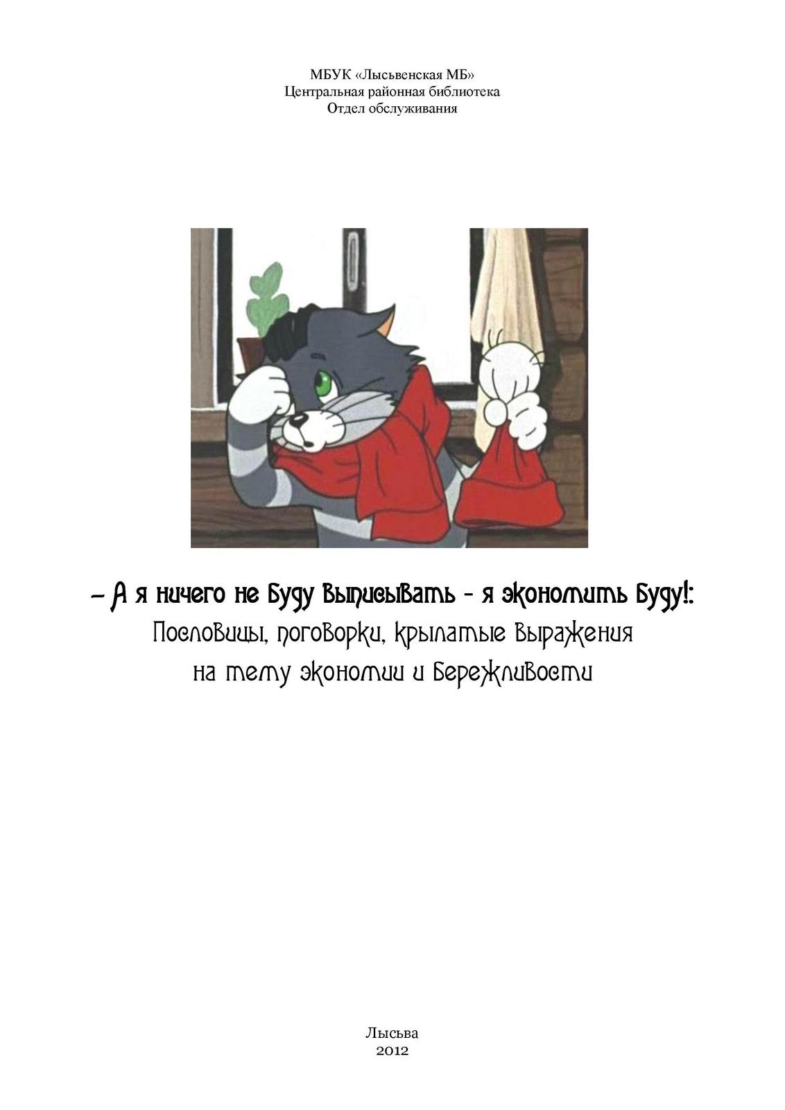 А я ничего не буду выписывать - я экономить буду! : Пословицы, поговорки, крылатые выражения на тему экономии и бережливости / МБУК «Лысьвенская МБ»; Центральная районная библиотека; Отдел обслуживания. – Лысьва : [б.и.], 2012. – 7 с.
