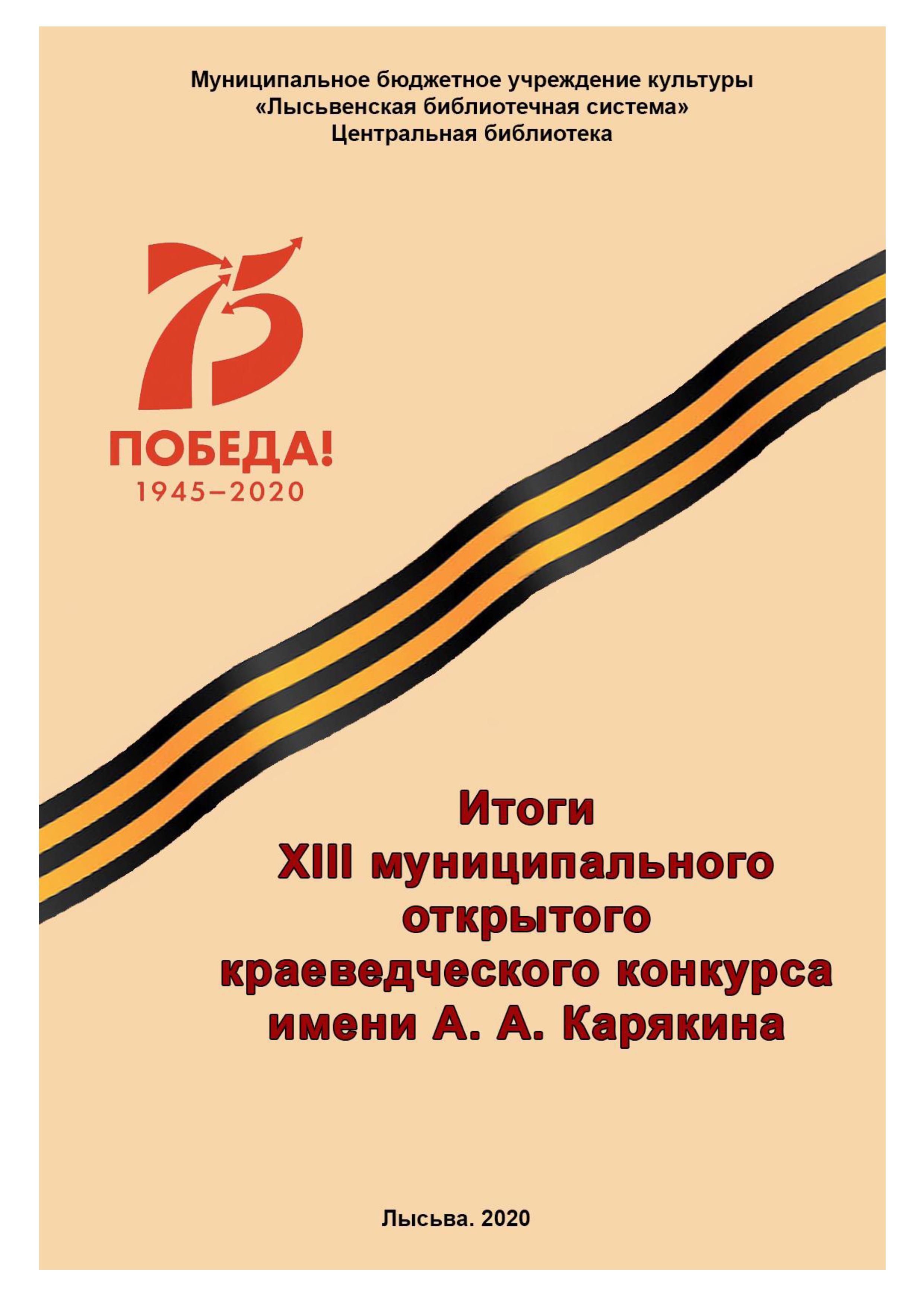 Итоги XIII муниципального открытого краеведческого конкурса имени А. А. Карякина / Муниципальное бюджетное учреждение культуры «Лысьвенская библиотечная система»; составитель Е. И. Завьялова. – Лысьва : [б.и.], 2020. – 8 с.