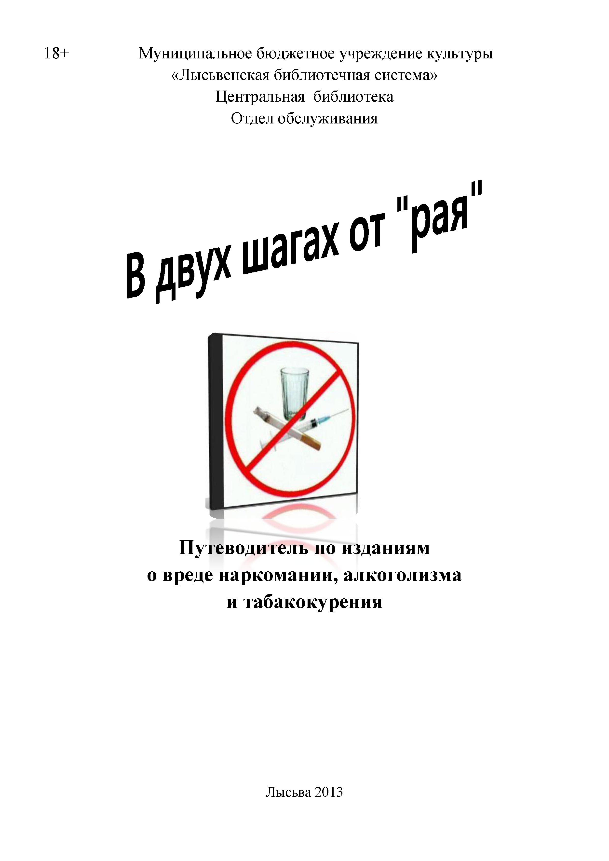 В двух шагах от «рая» : путеводитель по изданиям о вреде наркомании, алкоголизма и табакокурения / сост. С. И. Шахторина. – Лысьва, 2013. – 29 с. : ил.