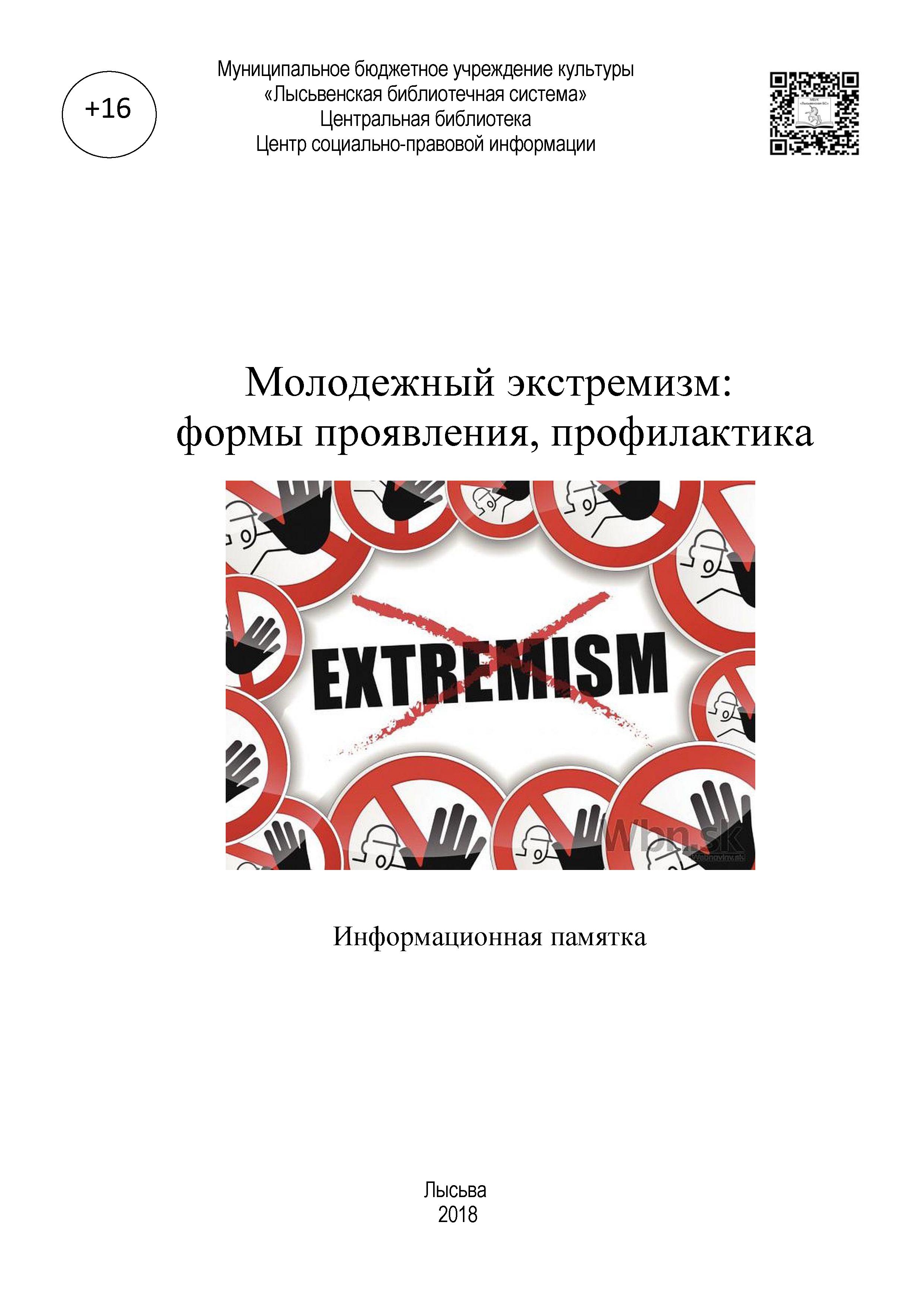 Молодежный экстремизм: формы проявления, профилактика: информ. памятка / МБУК «Лысьвенская БС». - Лысьва: [б.и.], 2018 . – 12 с.